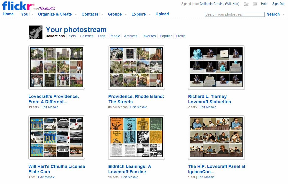 My CthulhuWho1 Flickr Collections have been neglected while I’ve been spending so much time here in the CthulhuWho1 Blog doing readings and other things; so I’m going to take a break from doing readings, so I can spend some time adding more photos and scans to the Flickr Collections, with updates of the activities being posted here.
