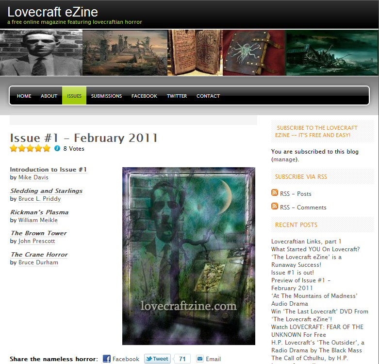 You can also jump right into Issue #1 by going directly to http://lovecraftzine.wordpress.com/issues/issue-1-february-2011/ where you’ll find Mike’s Introduction, and the first four stories: Sledding and Starlings by Bruce L. Priddy, Rickman’s Plasma by William Meikle, The Brown Tower by John Prescott, and The Crane Horror by Bruce Durham.