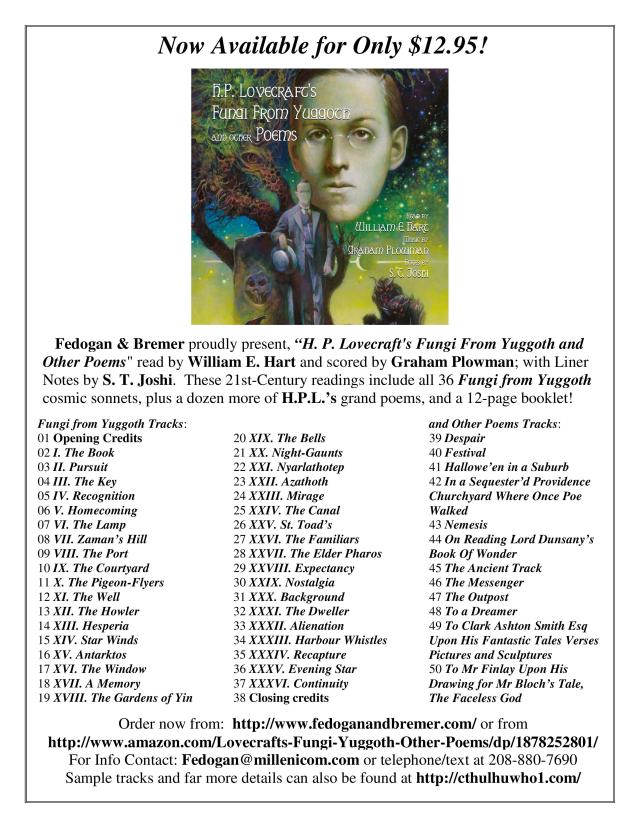 The folks over at Fedogan & Bremer, and Composer Graham Plowman, have all approved my request to share the following three complete tracks from our “H. P. Lovecraft’s Fungi From Yuggoth and Other Poems” CD (published by Fedogan & Bremer (2016)), in a visual form on YouTube, so everyone can hear (and read) some full-length examples of what’s on the 48-track CD.